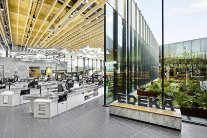 The EDEKA Center in Gaimersheim has been awarded the highest possible status by the German Sustainable Building Council (DGNB): “Platinum”. The innovative energy concept helps to save significant amounts of CO2 compared to ordinary stores. The integrated cooling/air-conditioning/heating compound system makes optimum use of energy flows by using waste heat for heating or surplus cooling generation for air-conditioning, depending on demand. The store’s special lighting concept also deserves special mention. The store’s state-of-the-art LED illumination automatically adjusts to the available daylight thanks to a digital lighting control system, saving up to 35 percent in energy costs.